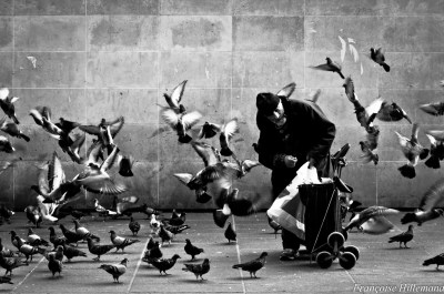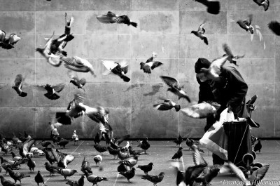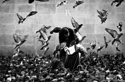 1. C'est drôle, en fait vues d'ici, on ne sent pas l'attachement de cet homme aux pigeons. On dirait plutôt le contraire : il est assailli par ces pigeons et tes photos m'évoquent réellement le danger. Probablement est-ce lié aussi au fait que cet homme est très courbé. La seconde photo est particulièrement éloquente d'ailleurs, ainsi que la 3ème. Ces deux là sont de loin mes préférées !